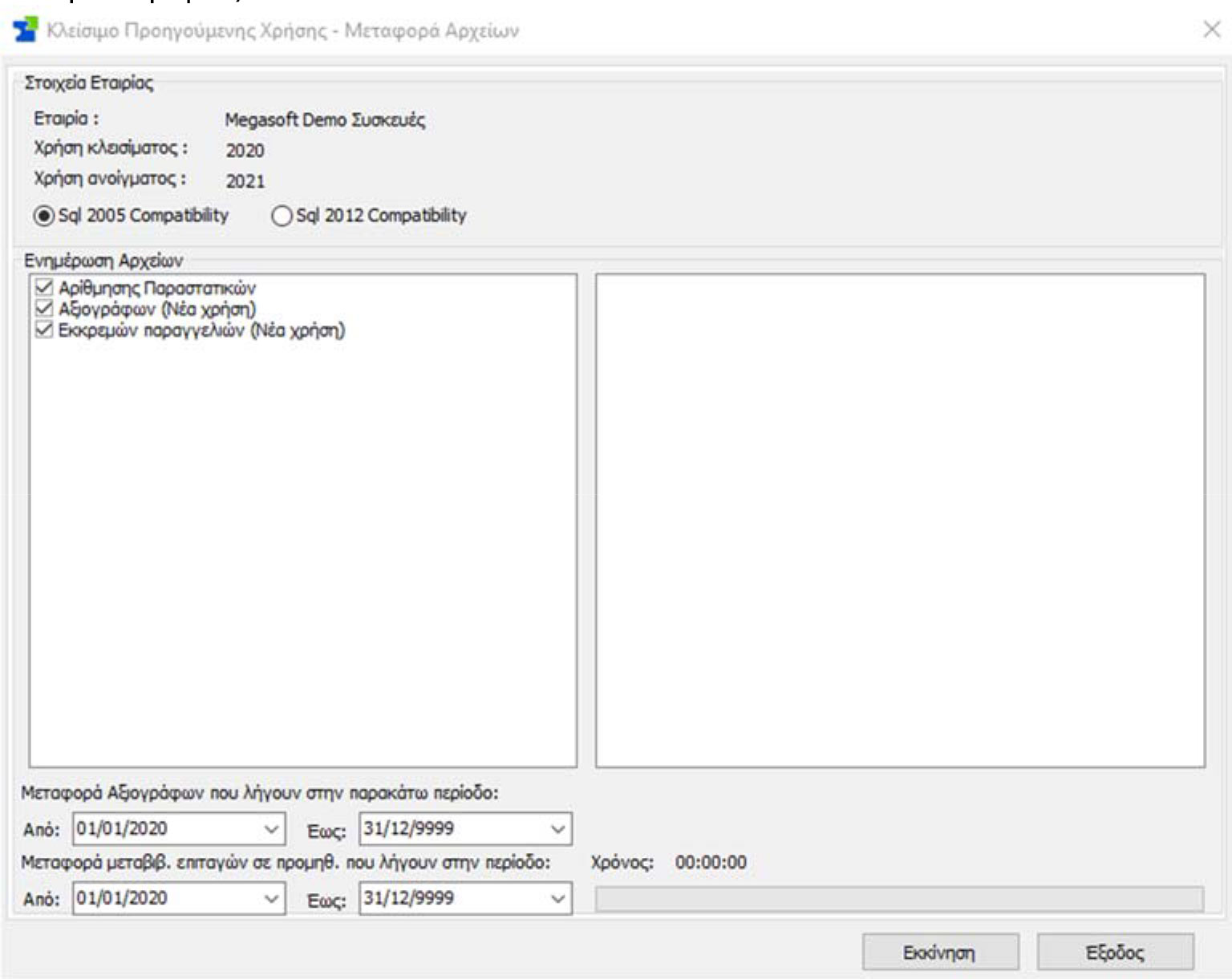 Για τα Αξιόγραφα σας δίνεται, επιπλέον, η δυνατότητα από τα πεδία ορισμού περιόδου να συμπεριλάβετε στη μεταφορά και εγγραφές με λήξη στην προηγούμενη χρήση. Τέλος, πατήστε το πλήκτρο Εκκίνηση για να ξεκινήσει η διαδικασία μεταφοράς.