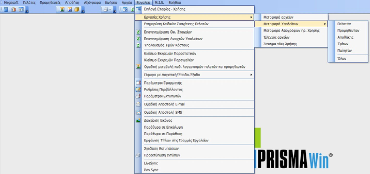 Εάν επιθυμείτε να μεταφέρετε υπόλοιπα επιλέξτε από το μενού Εργαλεία -> Εργασίες Χρήσης -> Μεταφορά Υπολοίπων. Σε περίπτωση που δε διαθέτετε μία από τις τελευταίες αναβαθμίσεις θα επιλέξετε από το μενού Εργαλεία -> Κλείσιμο* Προηγούμενης Χρήσης την εργασία Μεταφορά υπολοίπων.