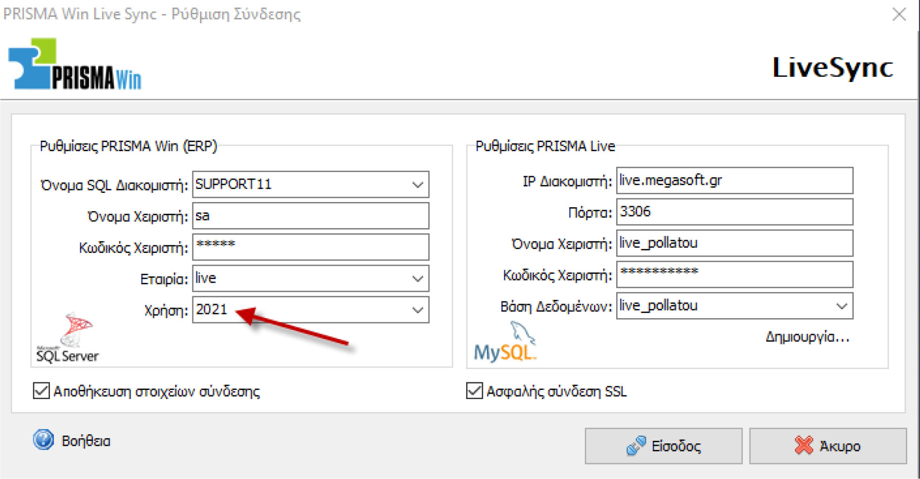 Προκειμένου να αλλάξετε τη Χρήση στο live και αφού έχετε καταχωρήσει και τις τελευταίες κινήσεις έως και τις 31 Δεκεμβρίου 2021, επιλέγετε Ενημέρωση Εμπορικού για να μεταφερθούν στην εμπορική διαχείριση στη χρήση του 2021. Στη συνέχεια πατάτε Αλλαγή Σύνδεσης και επιλέγετε τη νέα χρήση του 2022. Τέλος, πατάτε Είσοδος για να αποθηκευτούν οι αλλαγές.