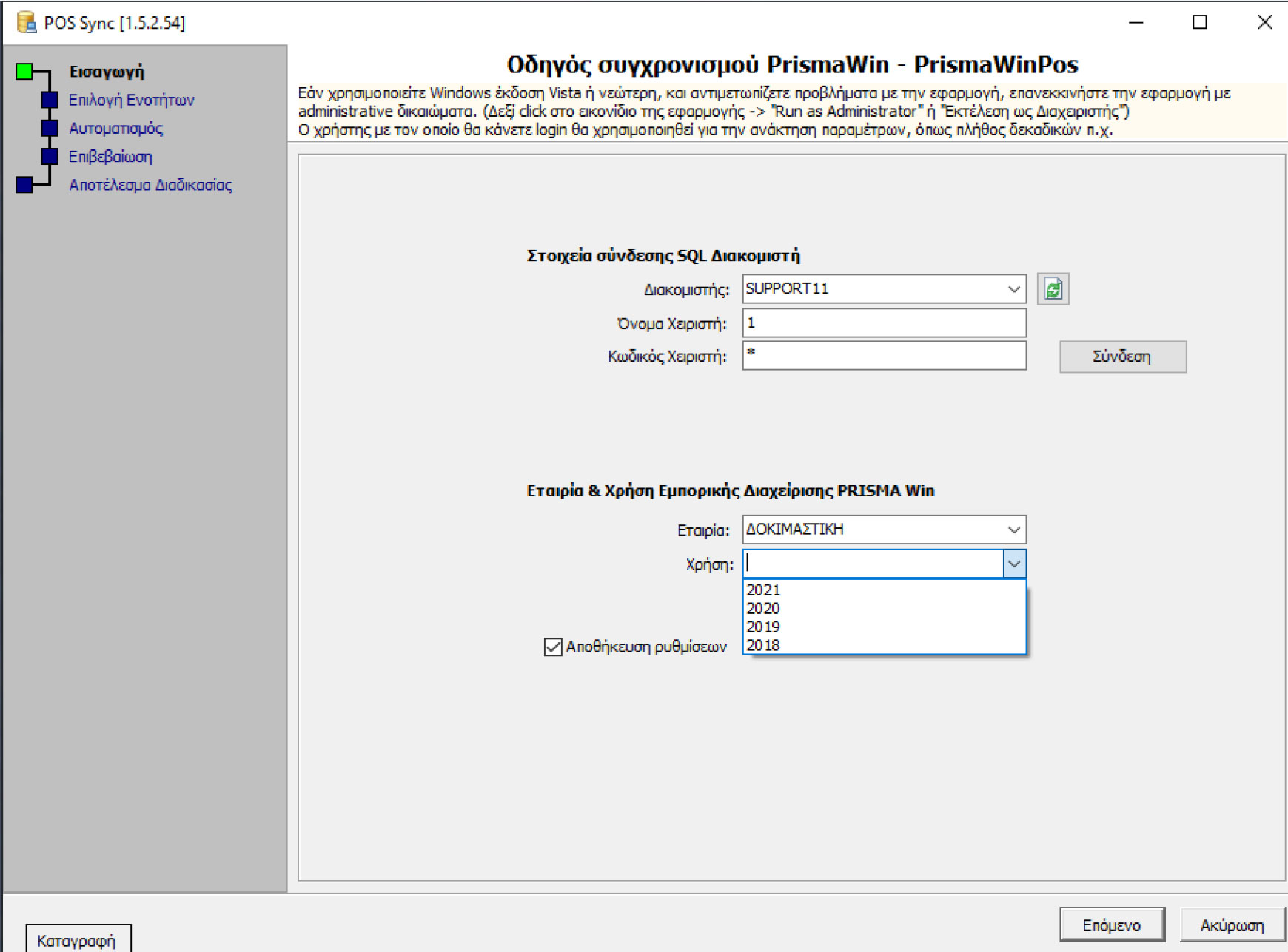 χρήση 2021. Αφού ολοκληρωθεί η διαδικασία της ενημέρωσης ξανατρέχετε το POS Sync και επιλέγετε τη νέα χρήση 2022.